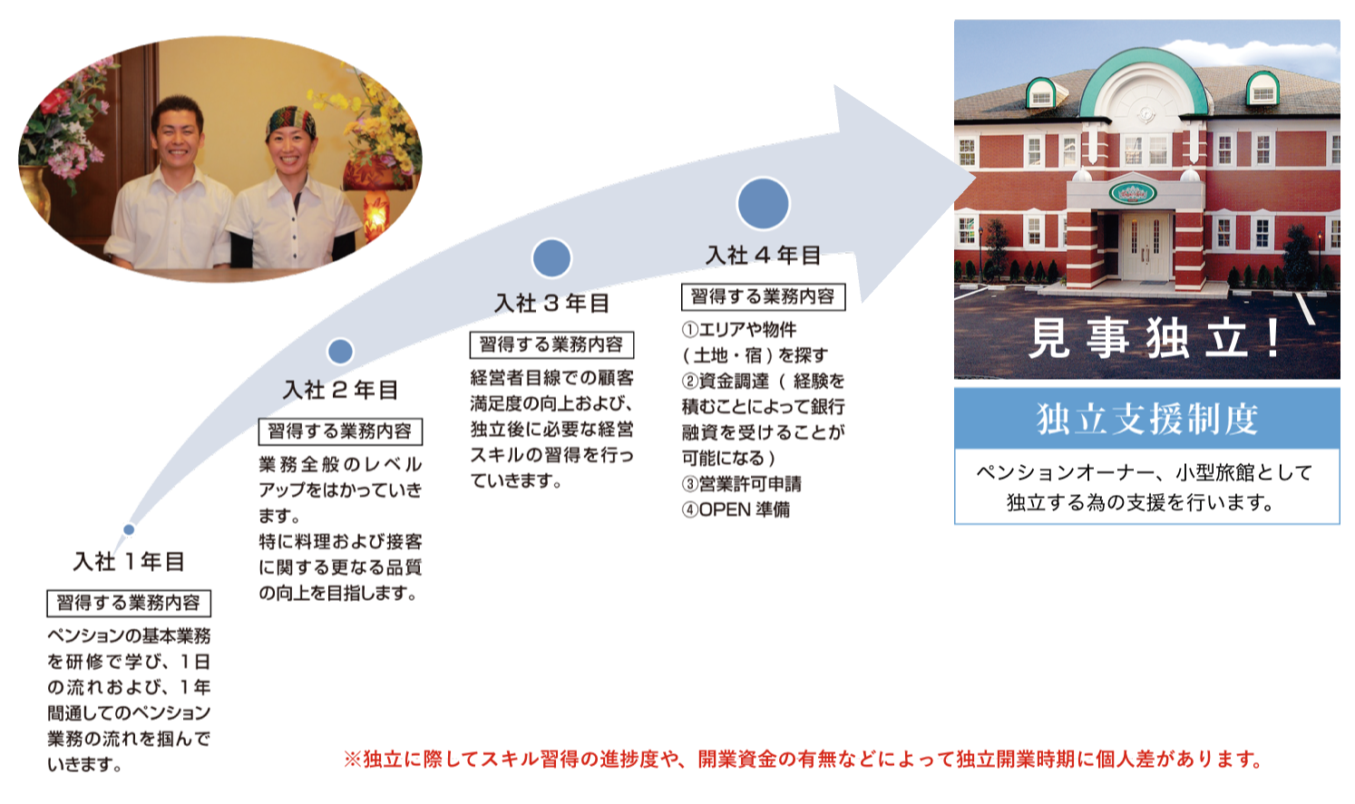 私達ユミィグループには、独立希望者にはペンション業界未経験の方でも、”ペンションオーナー”になれる教育および独立支援制度があります。 しっかり、2ヶ月間の基本スキル研修を受けた後に、各業務のレベルアップをはかりながら、さらに経営スキルを学び、しっかりとしたペンションオーナーを目指していきます。そして、独立する際にも開業のための準備をサポートし、独立後もよい協力体制を築いています。
